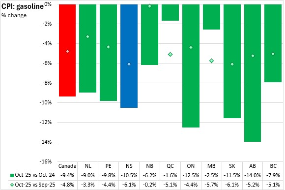 Gasoline prices were down 6.1% from September to October in Nova Scotia and down 4.8% nationally. All provinces reported monthly declines in gasoline prices, led by Alberta.