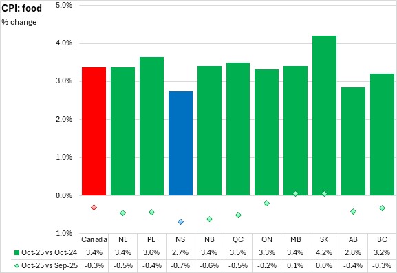Food prices increased 2.7% in Nova Scotia year-over-year, below national average food price inflation of 3.4% in October 2025. Food prices were up in every province, led by Saskatchewan.