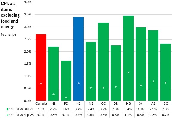 On a monthly basis, Nova Scotia's prices for all items excluding food and energy were up 0.7% from September to October. Nationally, prices for all items excluding food and energy were up 0.7%, with gains in all provinces led by Manitoba. Prince Edward Island had the smallest monthly decline in prices for all items excluding food and energy.