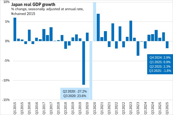 First estimates indicate that the Japanese economy (real GDP) contracted at a seasonally adjusted annualized rate of 1.8% in the third quarter of 2025. This was the first quarter of decline since Japan's economy recovered from recession in mid-2024.