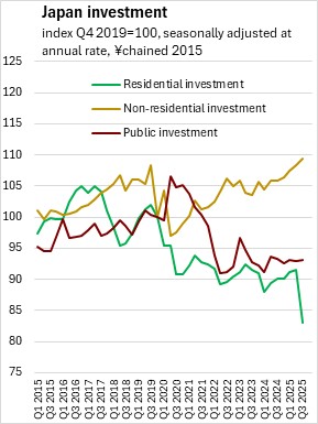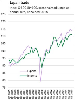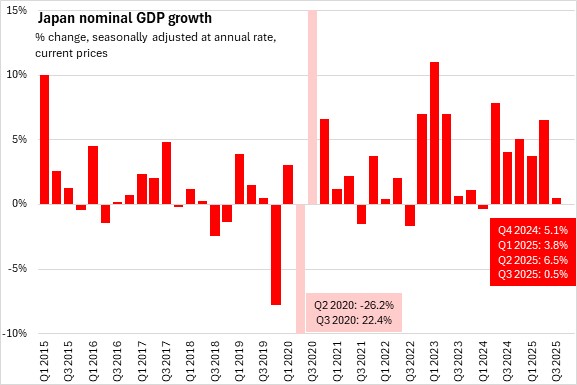 Japan's nominal GDP growth slowed to 0.5% (seasonally adjusted annualized rate) in Q3 2025, down from 6.5% in Q2 2025. The price deflator for Japan's real GDP (the broad measure of price growth) increased at a seasonally adjusted annualized rate of 2.5% in Q3 2025, slowing from 4.0% in the second quarter.