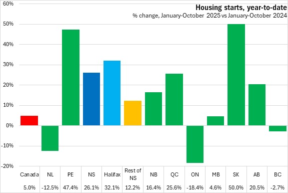 Nova Scotia housing starts rose 26.1% in the first ten months of 2025 compared to the same period a year ago. Halifax housing starts have increased 32.1% in January-October 2025 compared to the same period a year ago, while housing starts in the rest of Nova Scotia rose 12.2%. Nationally, housing starts grew 5.0% in the first ten months of 2025, with gains in all provinces except Newfoundland and Labrador, Ontario and British Columbia. Saskatchewan and Prince Edward Island posted the largest gains while Ontario posted the fastest decline.