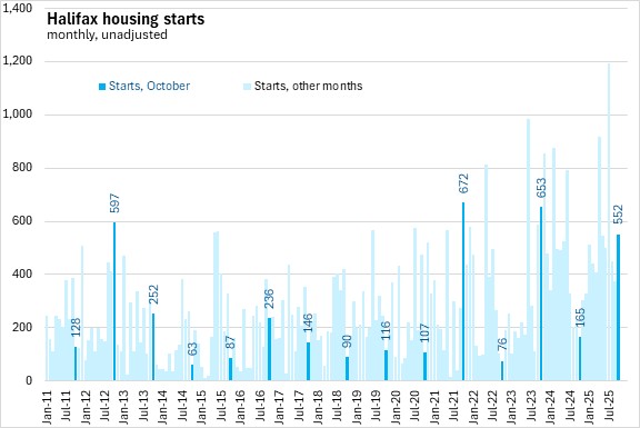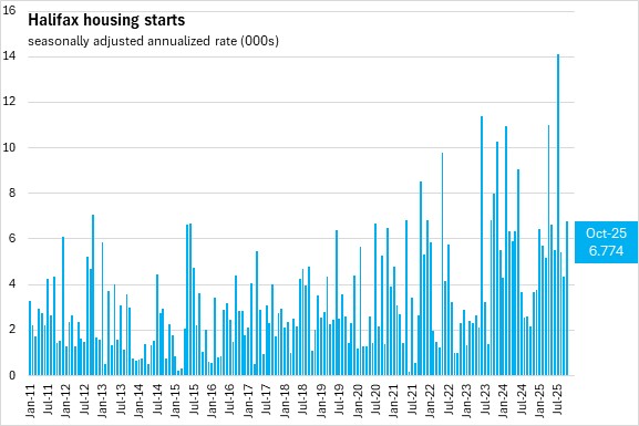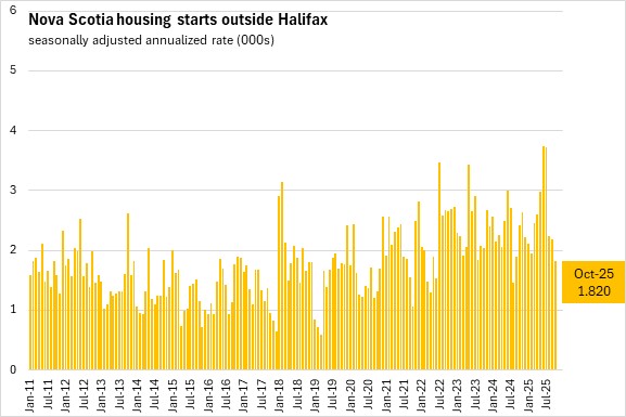 Outside of Halifax, housing starts declined to a seasonally adjusted annualized rate of 1,820 units in October 2025, down 16.8% from a revised 2,188 units in September 2025.