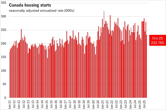 Across Canada, housing starts declined to a seasonally adjusted annualized rate of 232,765 units in October 2025, down 16.6% from a revised 279,174 units reported in September 2025.