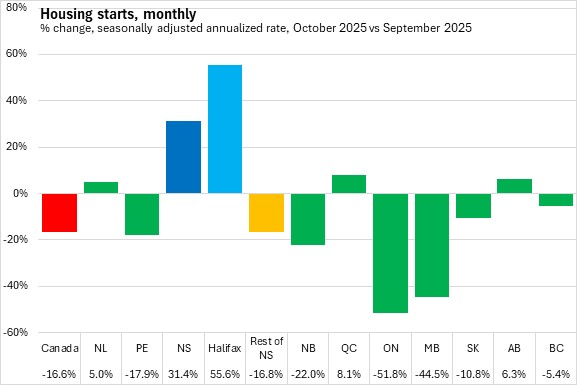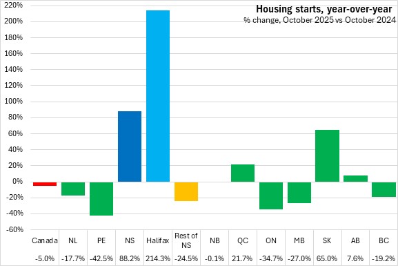 Nova Scotia's housing starts were up 88.2%, the fastest year-over-year gain among provinces, compared with the 4,567 unit pace set in October 2024. Halifax housing starts were up 214.3% from their rate in October 2024 (2,155). Housing starts outside the city were down 24.5% year-over-year from their pace in October 2024 (2,412). Across Canada, housing starts were down 5.0% year-over-year in October 2025 with declines in six provinces led by Prince Edward Island.