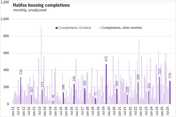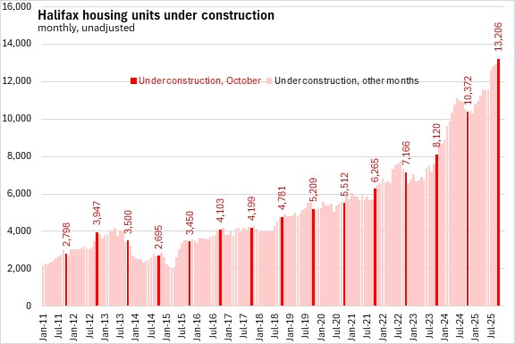 In unadjusted results for Halifax in October 2025, there were 552 housing starts and 276 completions. The stock of units under construction rose to 13,206 units in Halifax from the previous month, up 27.3% from units under construction in the same month last year (10,372).