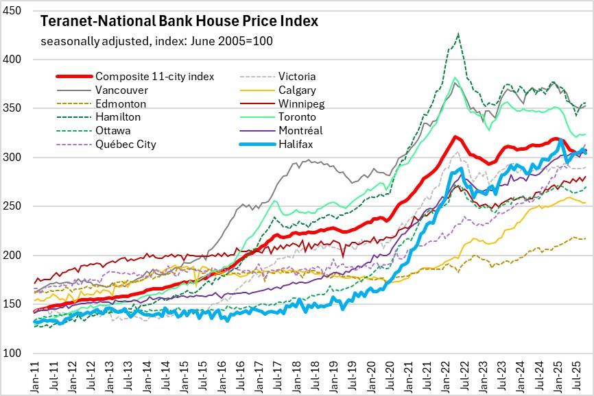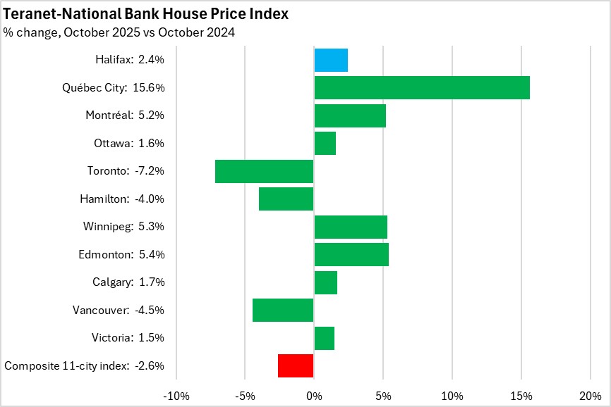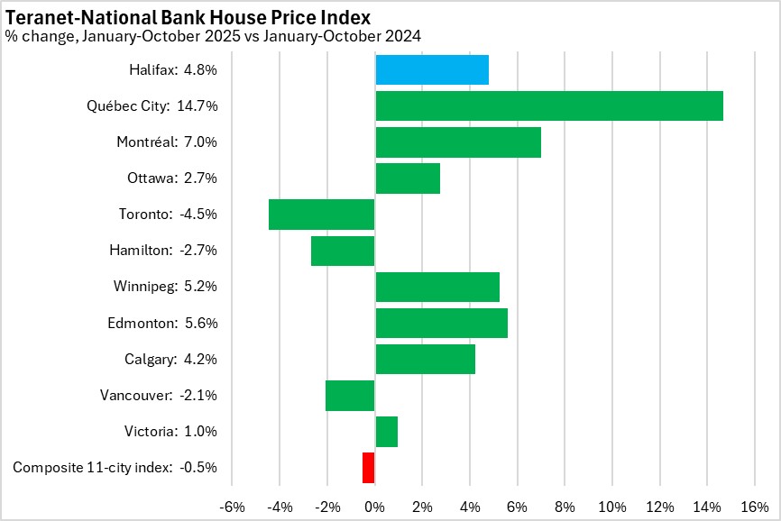 Halifax home prices were up 4.8% in the first ten months of 2025 when compared with the same period in 2024. The 11-city index in resale home prices was down 0.5% in the first ten months of 2024. Every city in the index except Toronto, Hamilton and Vancouver reported gains in year-to-date average home prices, with Québec City reporting the largest increase.
