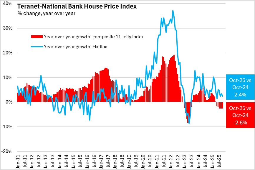 Halifax resale home prices were up 2.4% year-over-year. Prices for the 11-city composite index were down 2.6% despite gains in eight of 11 urban centers. Québec City reported the fastest pace of growth over October 2024 while the fastest decline was in Toronto.