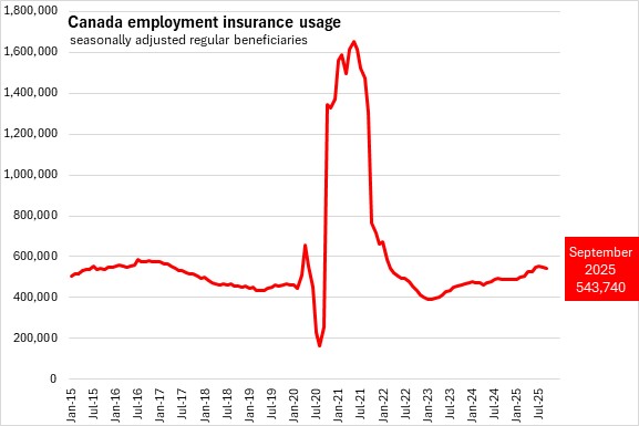 There were 543,740 Canadians that received regular employment insurance benefits in September 2025 (seasonally adjusted), a decrease of 6,220 (-1.1%) from the revised August 2025 value.