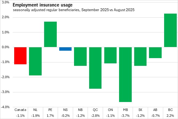 Eight provinces reported lower employment insurance usage in September, led by Manitoba and Québec. Compared to August 2025, Prince Edward Island and British Columbia were the only provinces to report higher employment insurance usage.