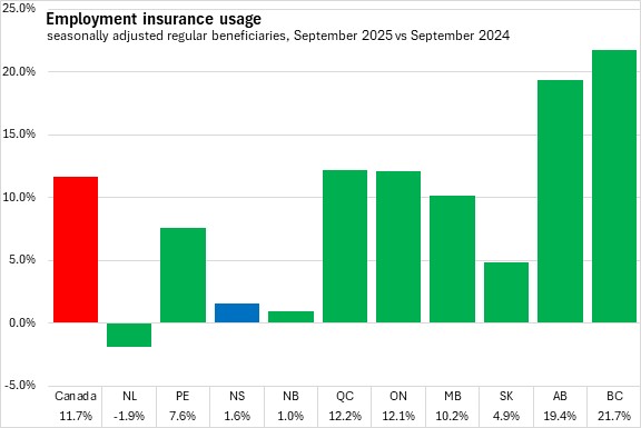 Compared to September 2024, Nova Scotia's employment insurance usage rose 1.6% (+350). National employment insurance usage increased 11.7% (+56,900) compared to September 2024. Nine provinces reported higher employment insurance compared to one year ago, with the fastest rise in British Columbia. Newfoundland and Labrador was the only province to report lower employment insurance usage over September 2024.