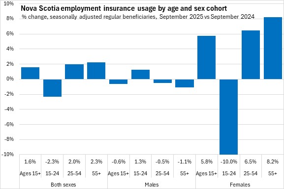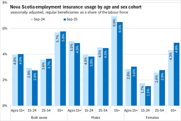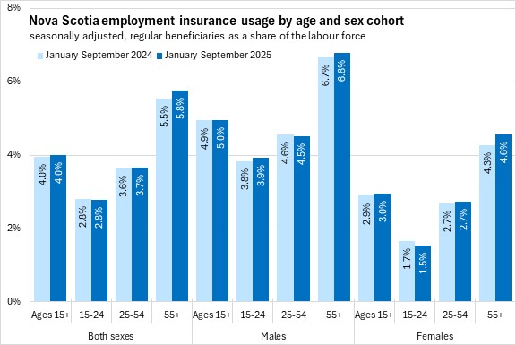 Use of employment insurance (as a share of the labour force) was lowest for youth (15-24) and highest for workers age 55 and over. Male use of employment insurance was higher as a share of the labour force than female use of employment insurance for all age cohorts in September 2025. Compared to one year ago, employment insurance usage as a share of the labour force was down for persons aged 15-24 and males. Female employment insurance usage as a share of the labour force was down for youth and up for other age cohorts.