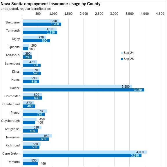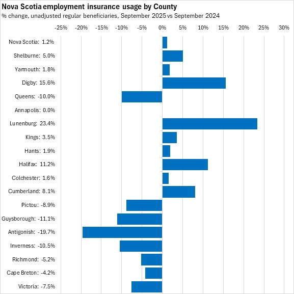 Comparing unadjusted regular beneficiaries for September 2025 against September 2024, the fastest growth in employment insurance usage (in percentage terms) was in Lunenburg county, followed by Digby county. The fastest declines were in Antigonish, Guysborough, Inverness, and Queens counties.
