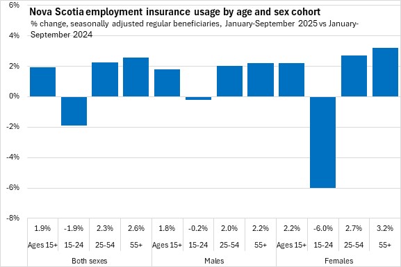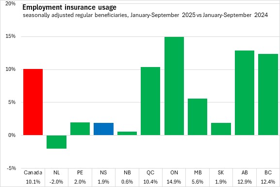 Compared to the first nine months of 2024, Nova Scotia's employment insurance usage increased 1.9%. National employment insurance usage increased 10.1%, year-to-date, with the fastest rise in Ontario. All provinces except Newfoundland and Labrador reported higher employment insurance usage year-to-date.