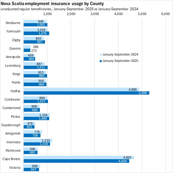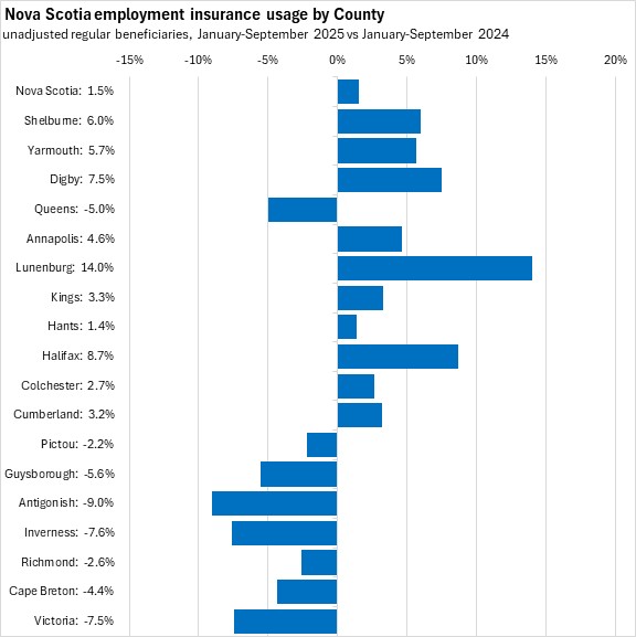 Comparing the first nine months of 2025 with the same period in 2024, employment insurance usage declined in Queens, Pictou, Guysborough, and Antigonish counties along with all four counties on Cape Breton Island. Employment insurance usage increased the most (in percentage terms) in Lunenburg, Halifax, and Digby counties.