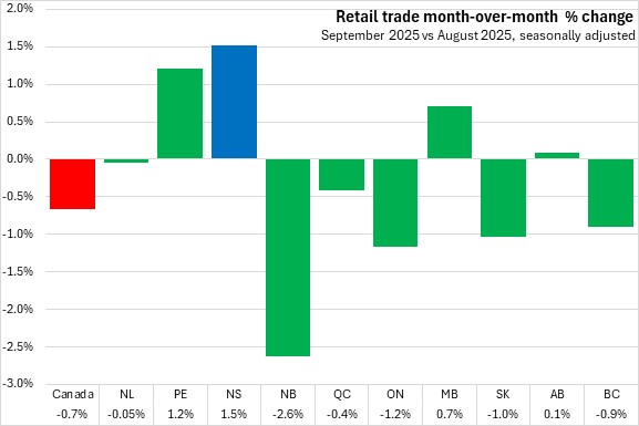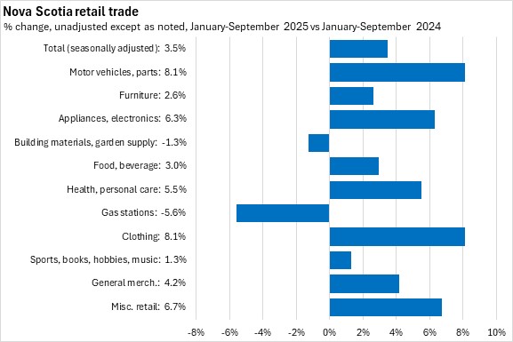 In dollar terms, motor vehicles/parts ($4.447 billion), food/beverage ($3.140 billion), gas stations ($2,272 billion) and general merchandise stores ($2.219 billion) contributed the most to Nova Scotia's retail sales in January-September 2025.
