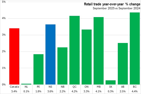 Nova Scotia retail trade increased 3.6% compared to the same month last year. Nationally, retail trade was up 3.4% year-over-year. All provinces reported year-over-year increases in retail trade, led by British Columbia. Saskatchewan and Newfoundland and Labrador reported the slowest growth rate.