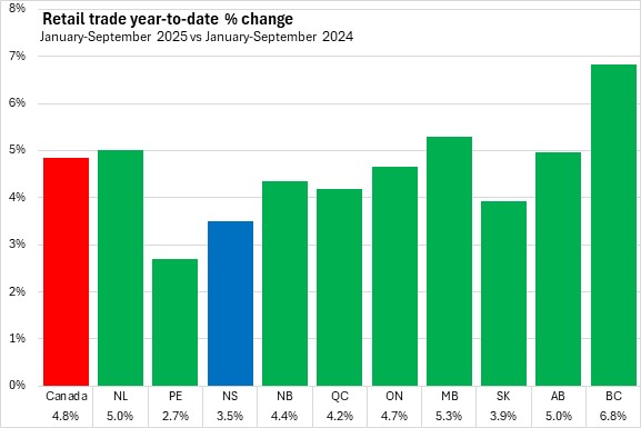 Nova Scotia retail trade increased 3.5% year-to-date compared to the same period last year. Nationally, retail trade was up 4.8% year-to-date. All provinces reported year-to-date increases in retail trade, led by British Columbia. Prince Edward Island reported the slowest growth (followed by Nova Scotia).