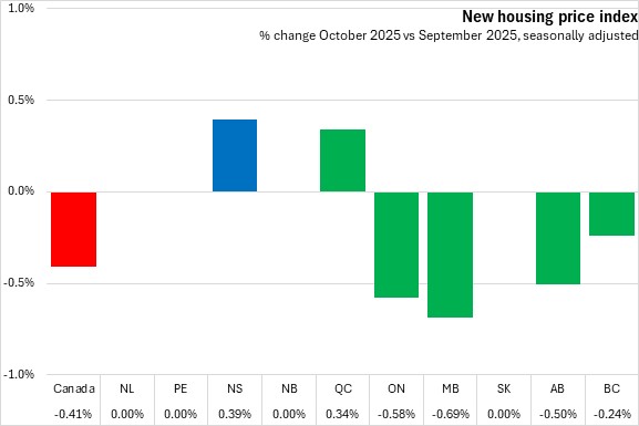 New housing prices in Nova Scotia increased 0.39% from September to October 2025. Nationally the price of new houses declined 0.41%, with four provinces reporting declines and four provinces reporting no change from the previous month. Nova Scotia and Québec were the only provinces to report increases over September, while the fastest declines were in Manitoba and Ontario.
