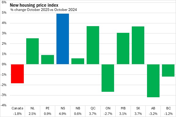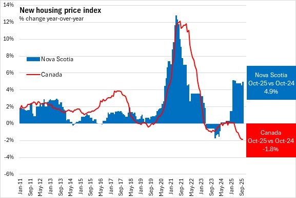 Nova Scotia’s new housing prices increased 4.9% from October 2024 to October 2025. Nationally, prices were down 1.8%.