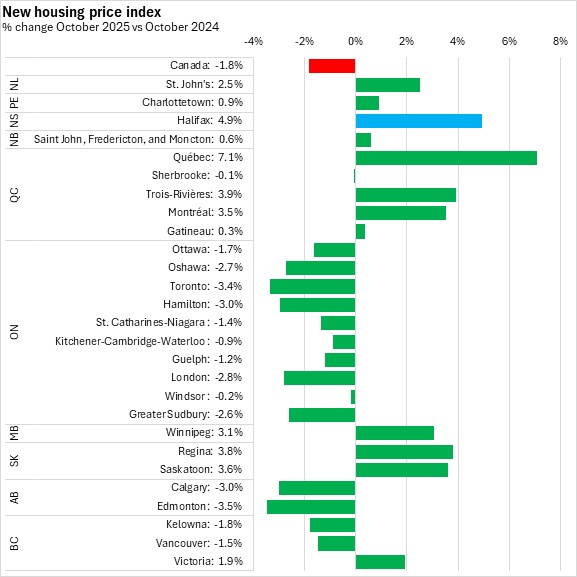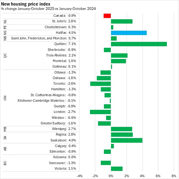 Halifax new housing prices were up 4.5% in January-October 2025 compared to January-October 2024. The fastest growth among CMAs was in Québec City and the fastest declines were in London and Toronto.