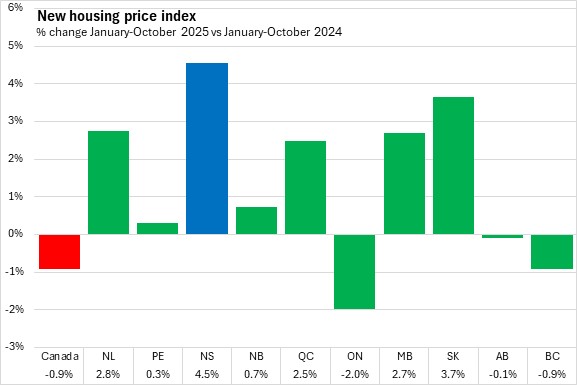 In the first ten months of 2025, Nova Scotia's new housing price index was 4.5% higher compared to the same period in 2024, the fastest increase among provinces. Nationally, new housing prices were down 0.9% year-to-date despite gains in seven provinces. Year-to-date declines in new housing prices were reported in Ontario (fastest), British Columbia and Alberta.