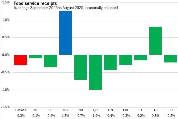 Nova Scotia food services and drinking places receipts led the provinces by increasing 1.3% to $207.3 million. Only Nova Scotia (+1.3%) and Alberta (+0.8%) reported increases. Canada food services and drinking places receipts decreased by 0.3% to $8.5 billion. Eight provinces, led by Québec reported declines.