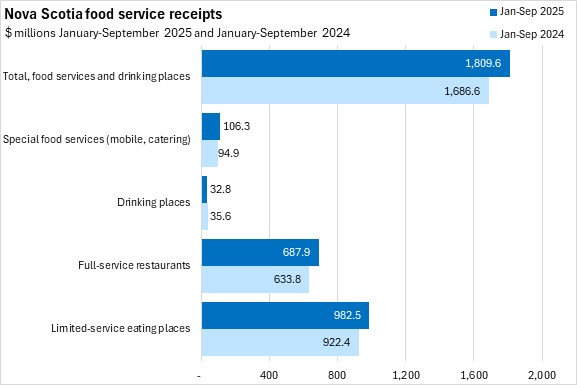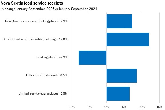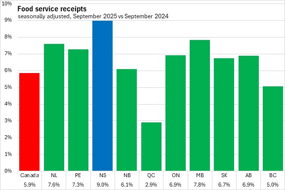 Nova Scotia reported the fastest year-over-year growth in food services and drinking places receipts at 9.0%. Canada's food services and drinking places receipts increased 5.9%. There were year-over-year gains in all provinces. Québec reported the smallest gain.