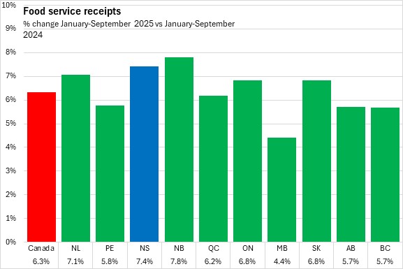 Nova Scotia's year-to-date food services and drinking places receipts increased 7.4%. Nationally food services and drinking places receipts increased 6.3%. All provinces reported a year-to-date increase in receipts. New Brunswick reported the fastest percentage gain in year-to-date food service receipts while Manitoba reported the smallest increase.