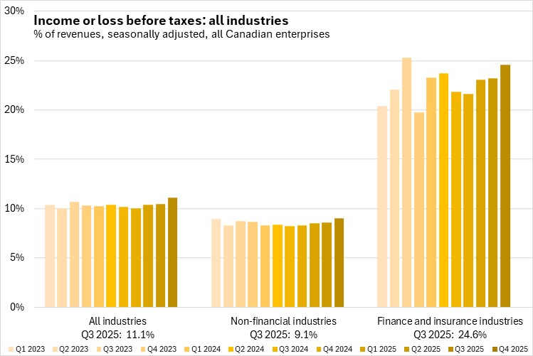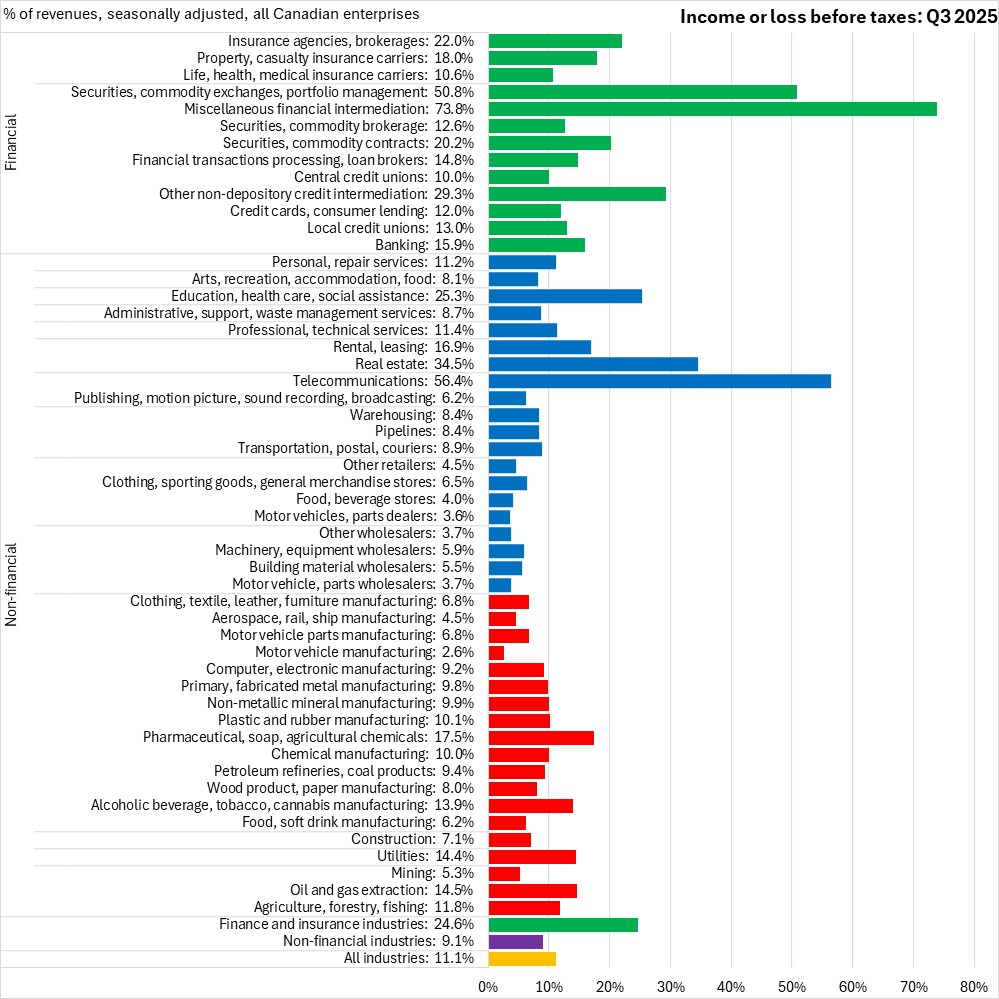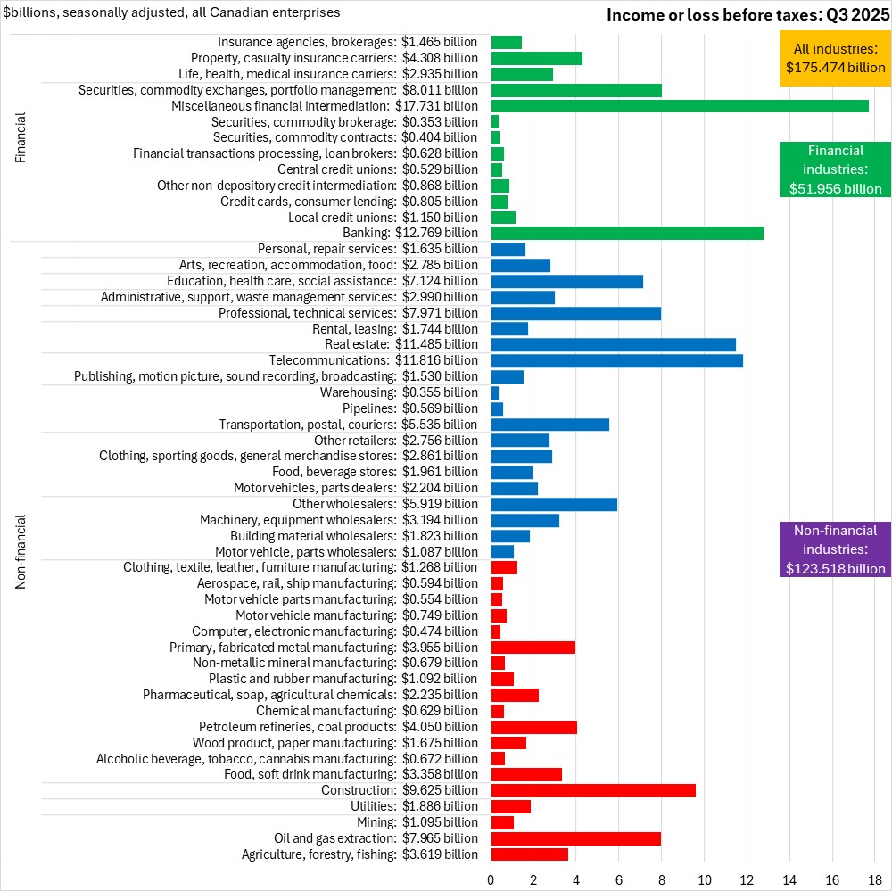 November 24, 2025CANADA FINANCIAL STATISTICS FOR ENTERPRISES, Q3 2025 In Q3 2025, Canadian enterprise net income before taxes (seasonally adjusted) was $175.474 billion. All broad industry categories reported positive income before taxes in Q3 2025. The largest values of net income before taxes were reported in miscellaneous financial intermediation ($17.731 billion), banking ($12.769), telecommunications ($11.816), real estate ($11.485 billion), and construction ($9.625).
