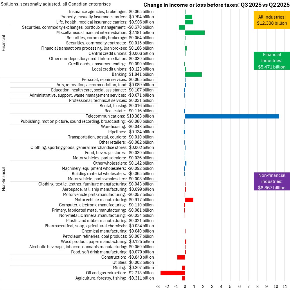 Net income for non-financial industries rose by $6.867 billion. Telecommunications is reported to have had a significant increase non-financial net income while oil/gas extraction posted the largest decline in non-financial net income in the Q3 2025.