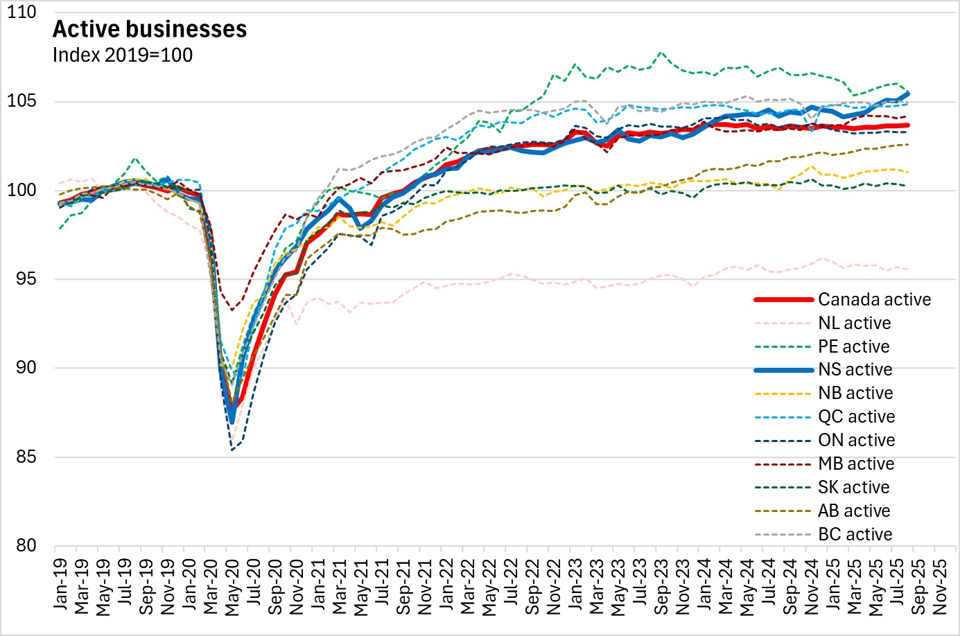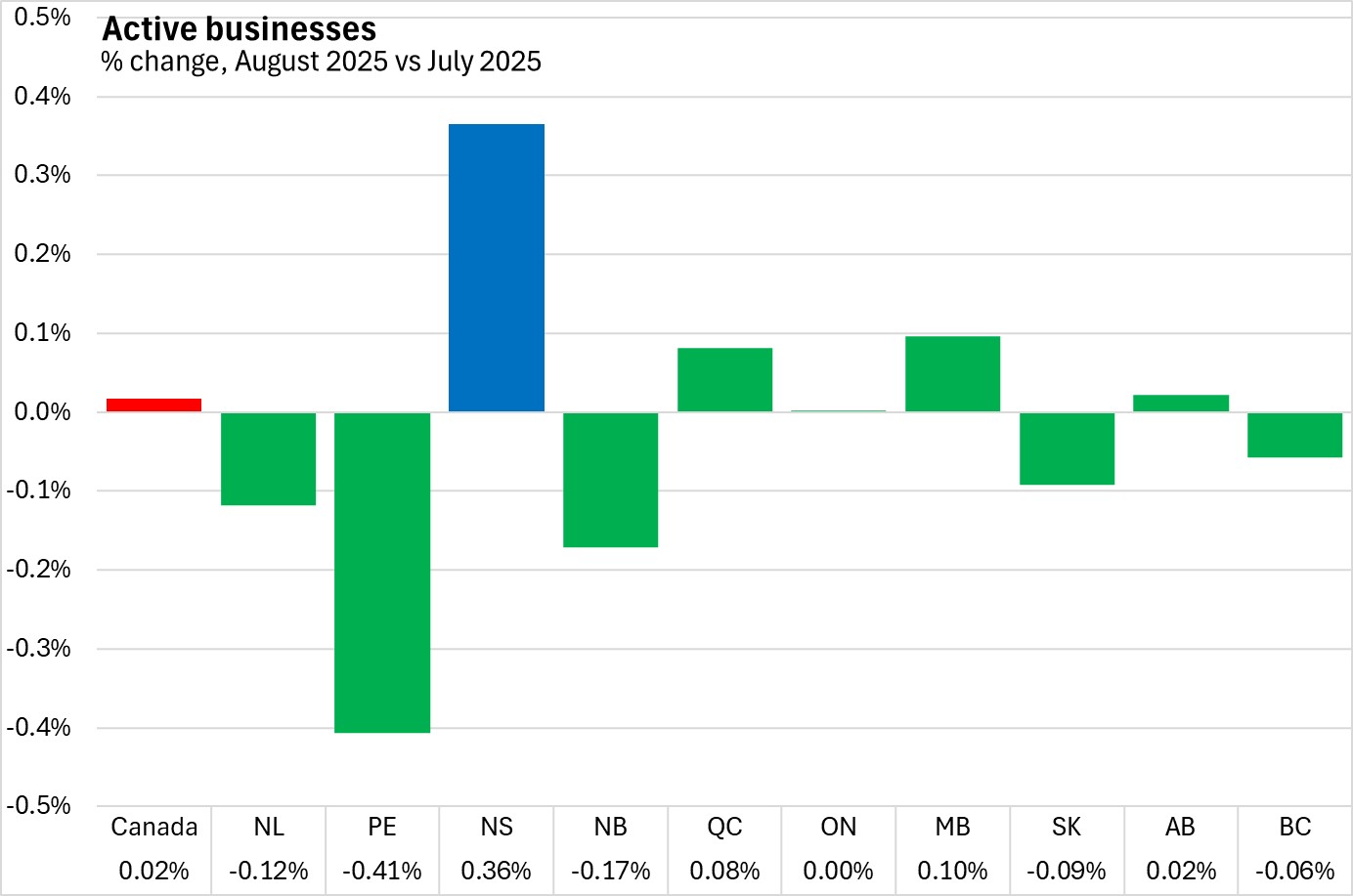 Nationally, active businesses were up 0.02%, with gains in five provinces. Nova Scotia posted the fastest gain, while Prince Edward Island reported the largest decline in active businesses.