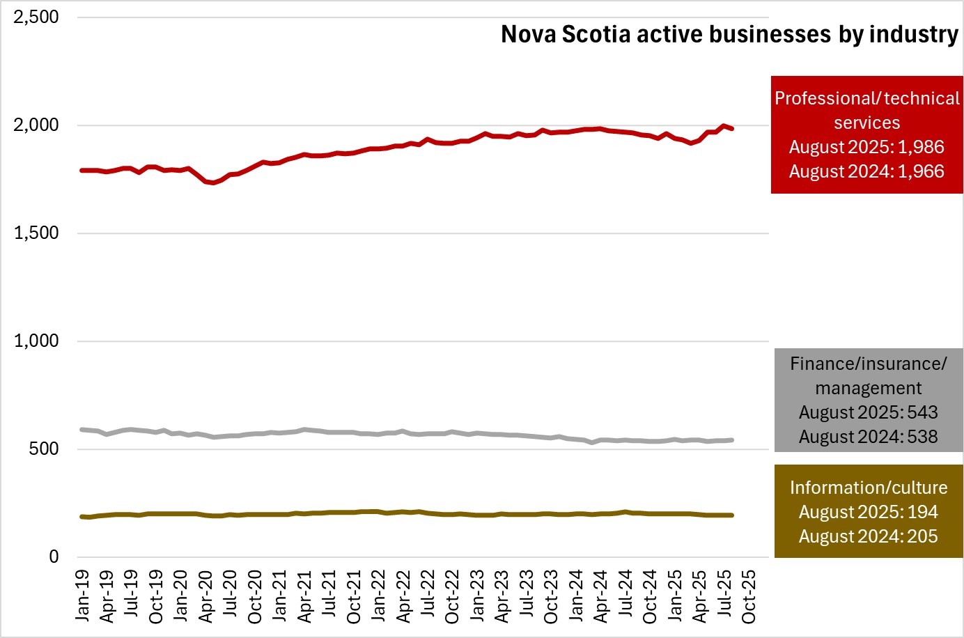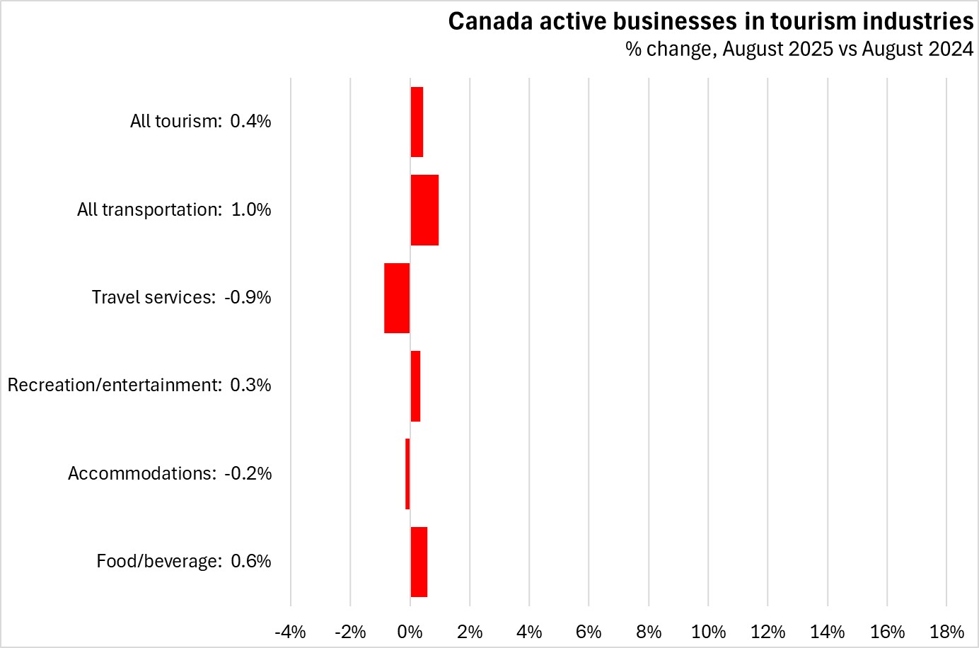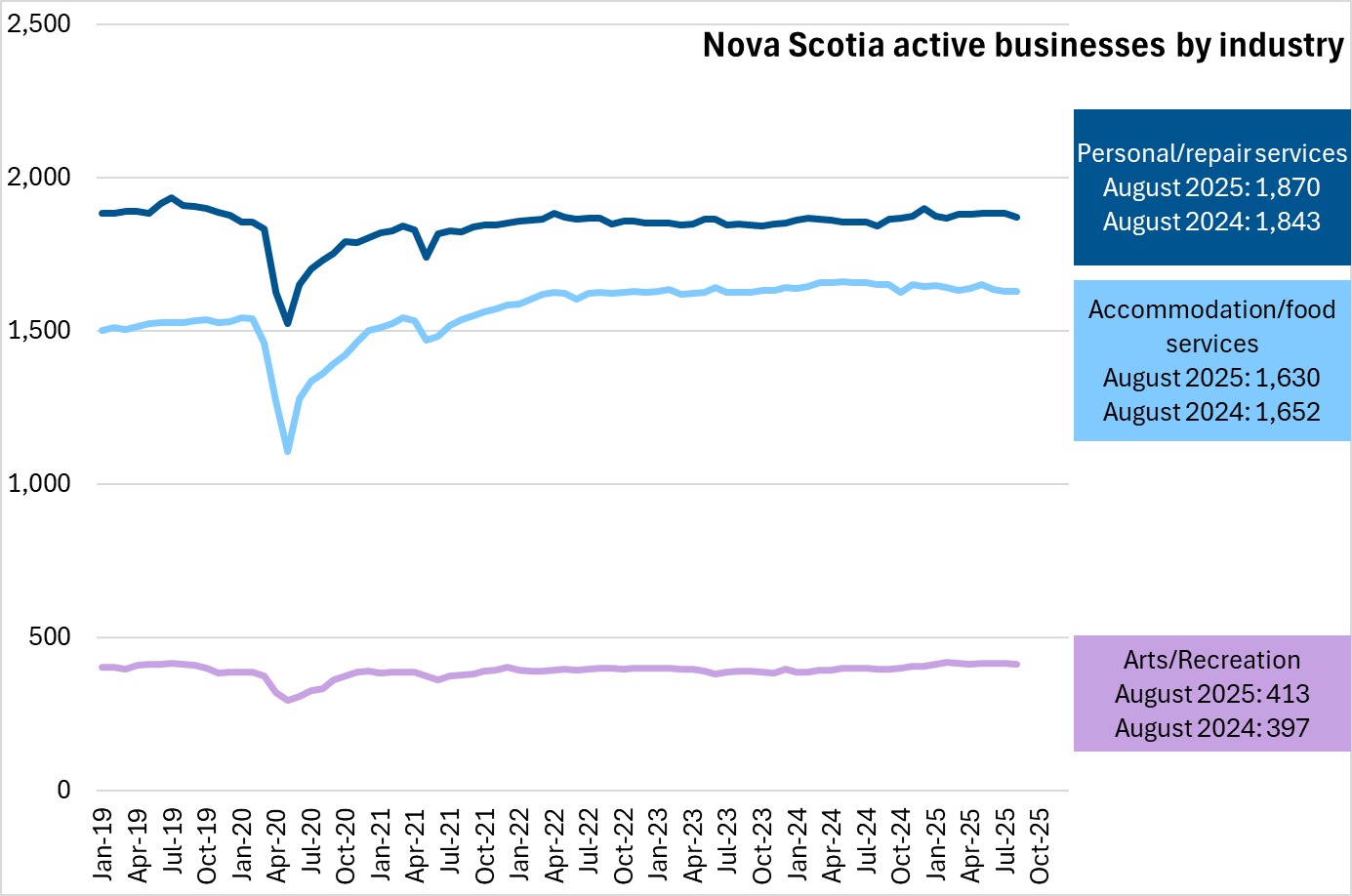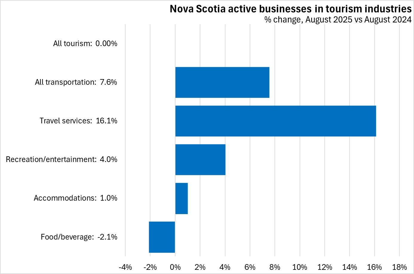Statistics Canada has broken out specific data for tourism-related industries. Compared with August 2024, the number of active tourism-related businesses remained unchanged in Nova Scotia as of August 2025, with gains in all subsectors offsetting a decline in food/beverage.
