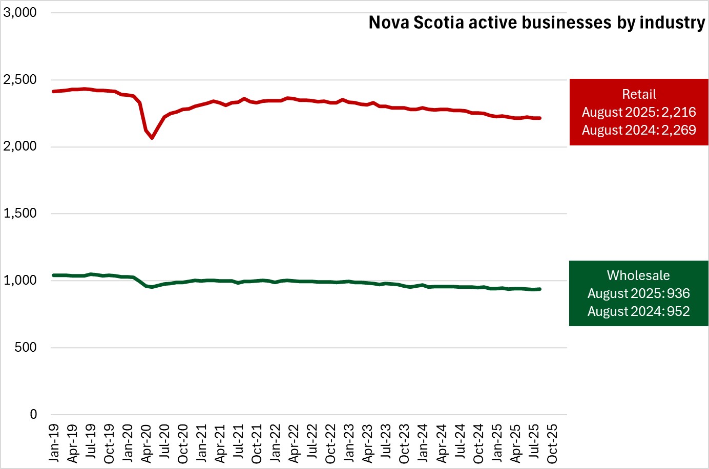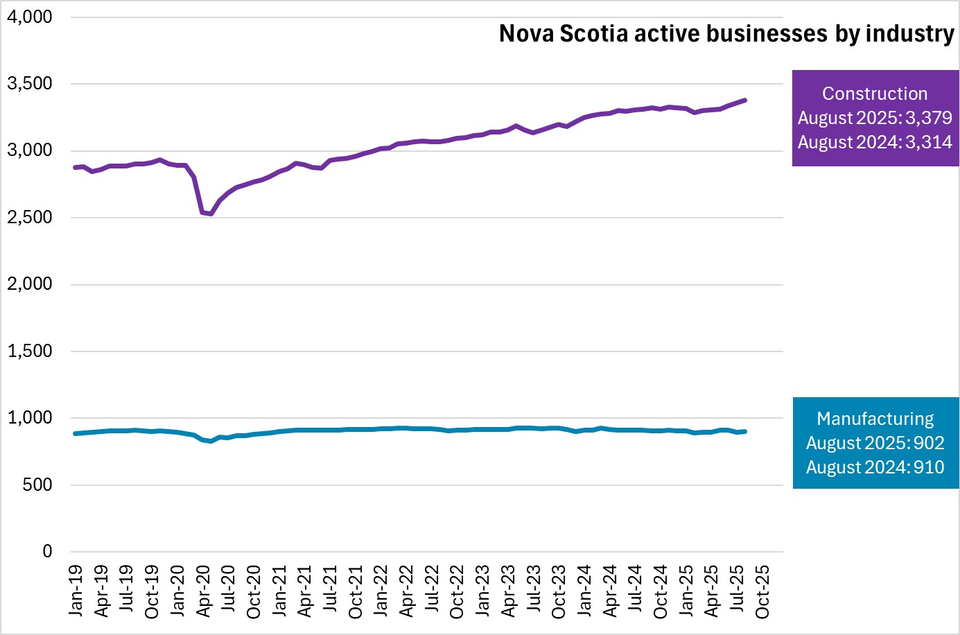 The number of active businesses in Nova Scotia grew by 0.36% from July 2025 to August 2025, rising by 77 to 21,182 active businesses.