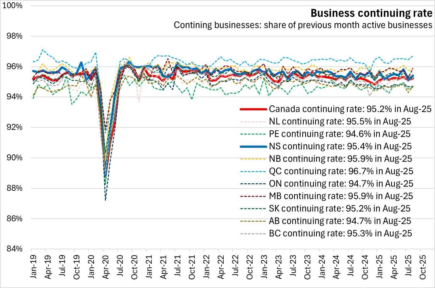 Most businesses continue operating each month. In August 2025, Nova Scotia's business continuing rate was 95.4%, slightly above the national average (95.2%). Québec reported the highest business continuing rate (96.7%) while Prince Edward Island reported the lowest continuing rate (94.6%).