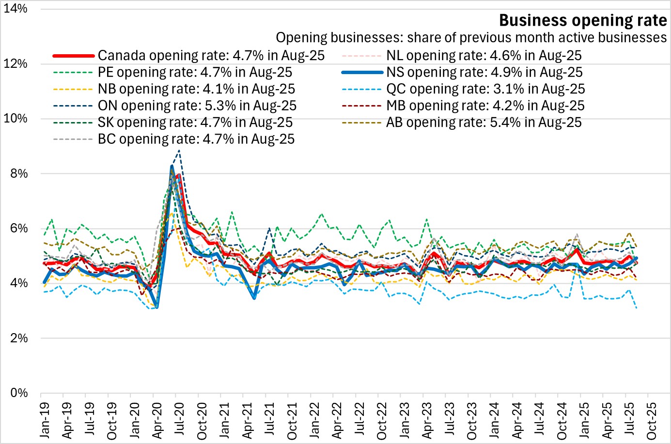Nova Scotia's business opening rate was 4.9% in August 2025, above the national average of 4.7%. Alberta had the highest business opening rate (5.4%) while Québec had the lowest (3.1%).