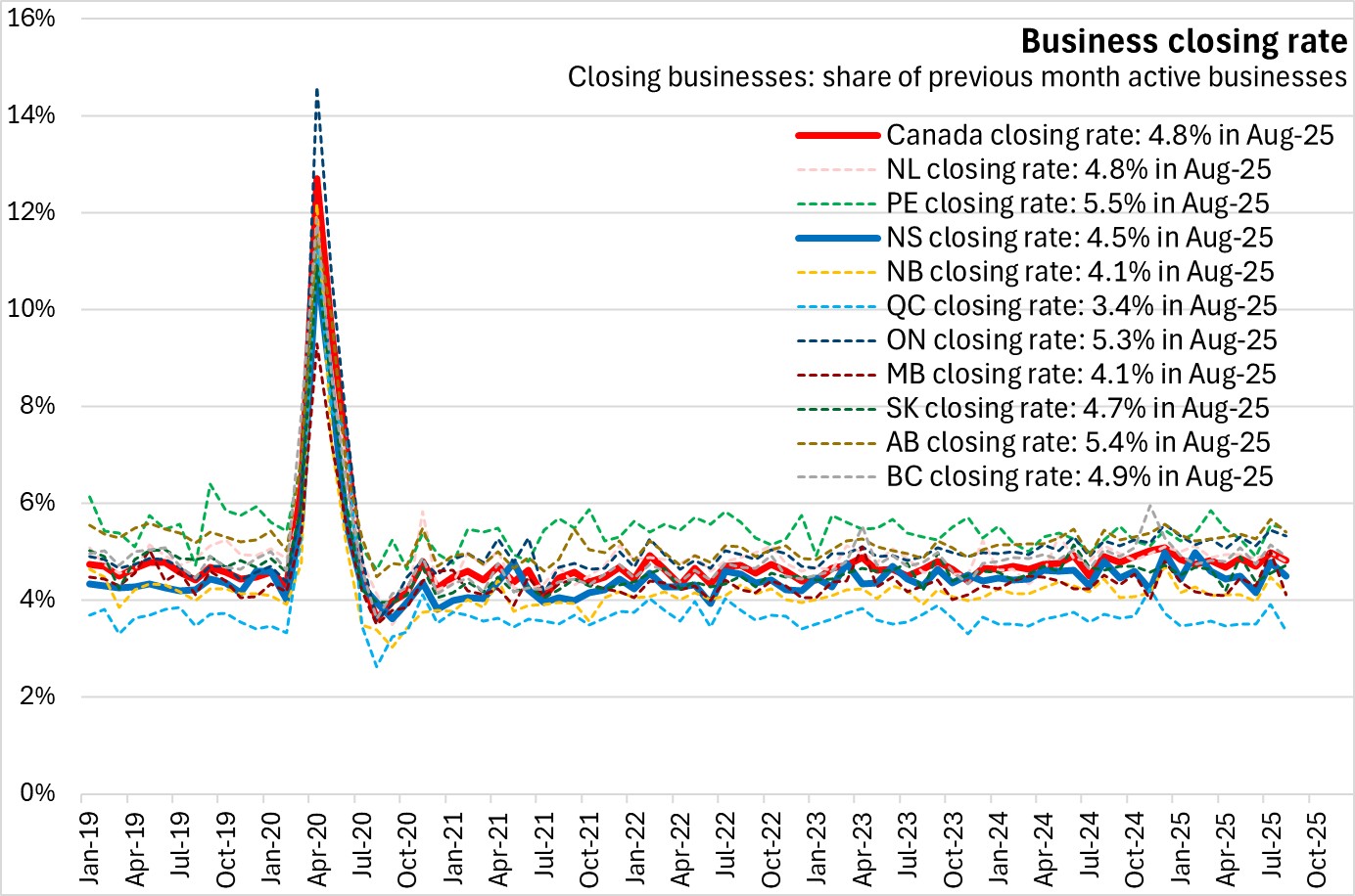 Nova Scotia's business closing rate was 4.5% in August 2025, below the national average of 4.8%. Prince Edward Island reported the highest business closing rate (5.5%), while Québec had the lowest business closing rate (3.4%).