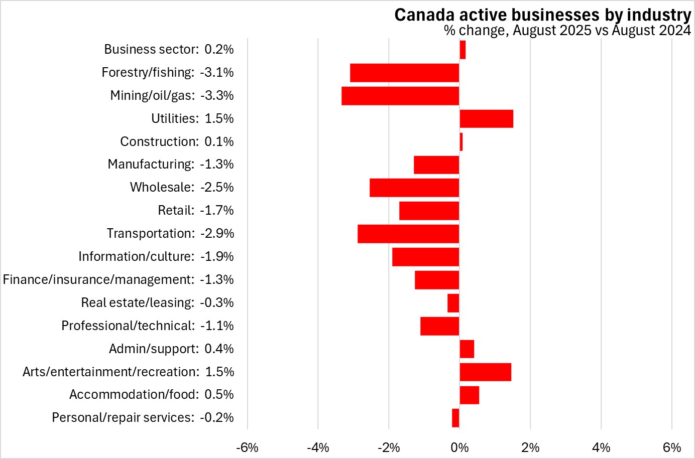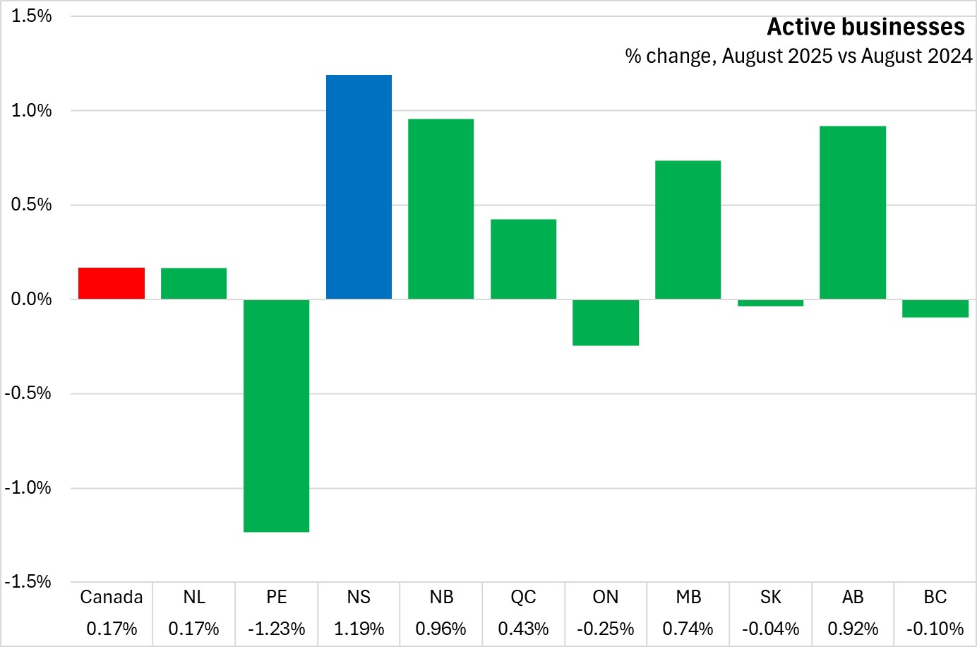 Compared with August 2024, the number of active businesses was up 1.19% for Nova Scotia, the largest increase among provinces. Nationally, active businesses were up 0.17% compared to August 2024. Prince Edward Island reported the largest year-over-year percentage decline in active businesses.
