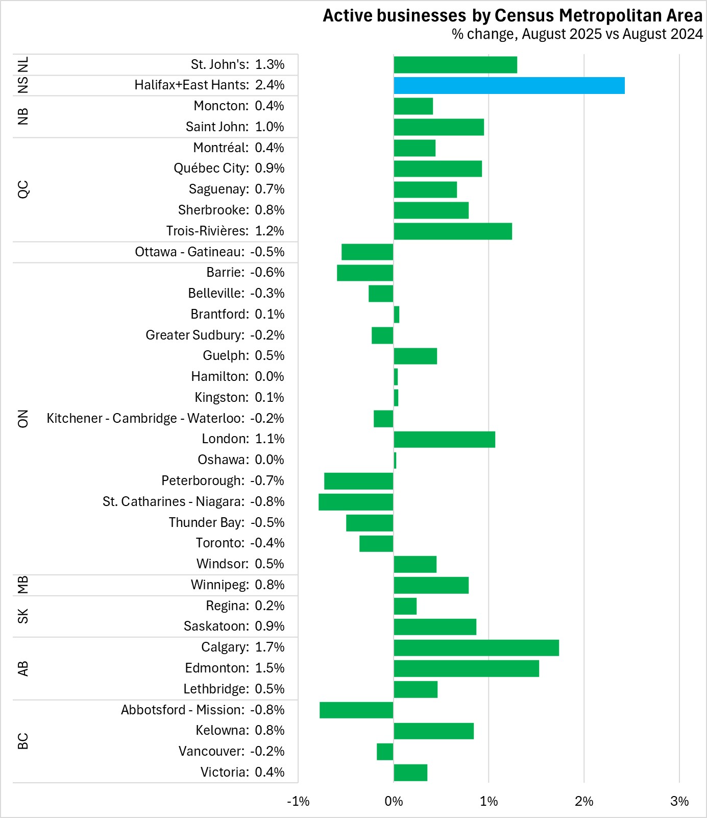 The number of active businesses in the Halifax and East Hants Census Metropolitan Area was up 2.4% from August 2024 to August 2025.