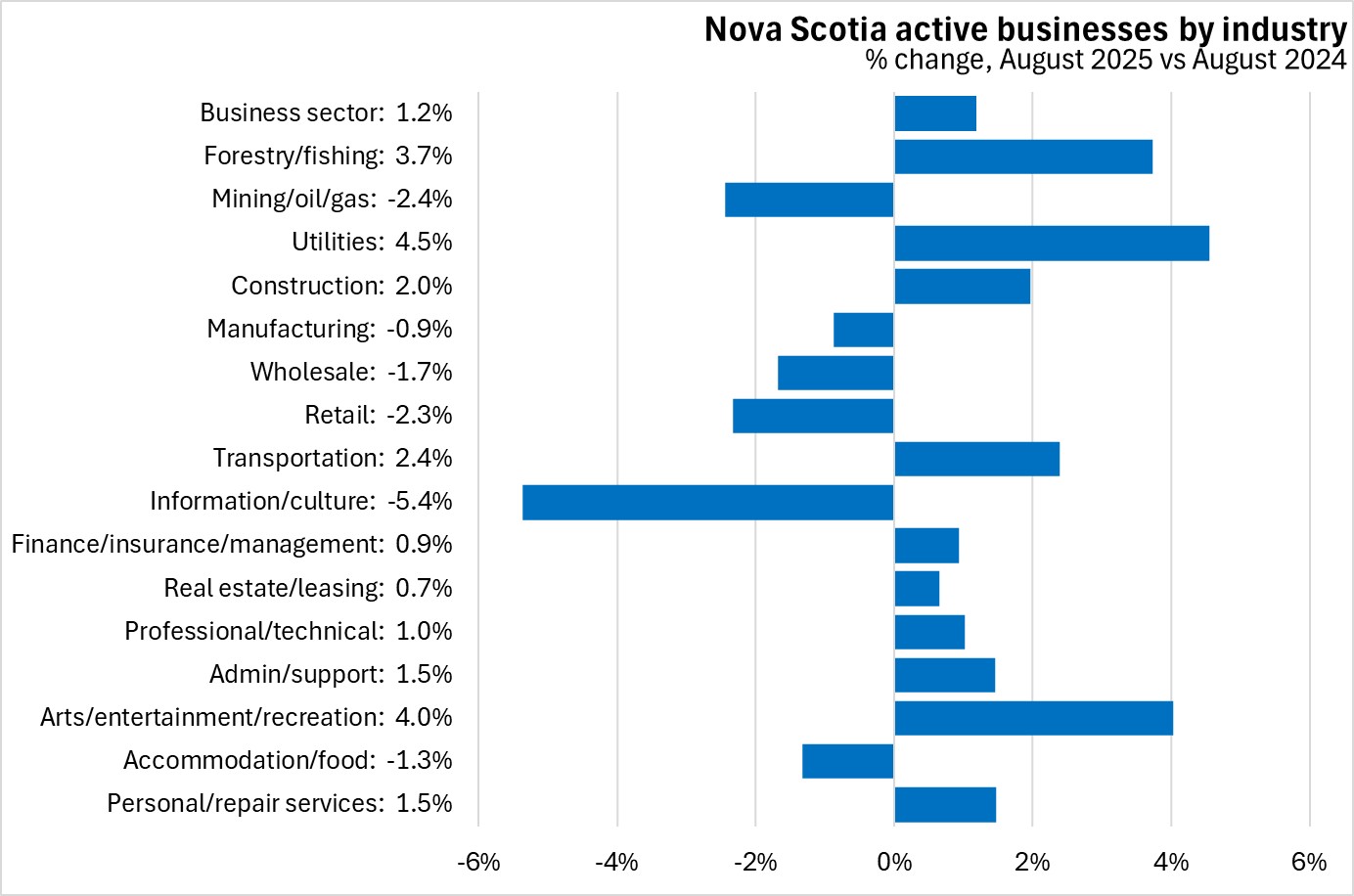 Compared with August 2024, ten sectors saw an increase in active businesses in Nova Scotia in August 2025 with the largest percentage increase in utilities. The steepest decline was in information/culture services.