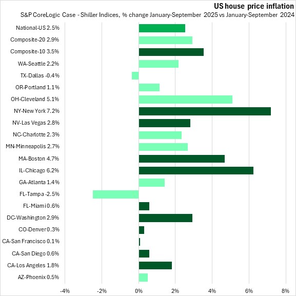 US national house prices rose by 2.5% in the first nine months of 2025 when compared to the same period last year. The 20-city composite average was up 2.9% and the 10-city composite was up 3.5%.