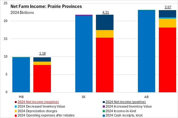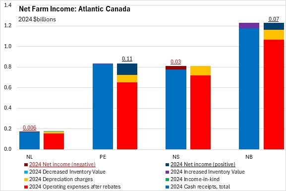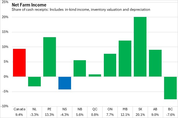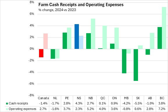In Nova Scotia, farms reported net loss of $33.5 million on cash receipts of $774.7 million, narrowing from a net loss of $53.0 million in 2023. Nova Scotia farm cash receipts were up 4.3% while operating expenses (after rebates) rose by 2.3%.
