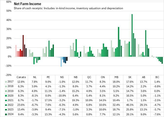 Net farm incomes as a share of cash receipts improved in all four Atlantic provinces in 2024. Net farm income declined as a share of cash receipts in all other provinces in 2024.