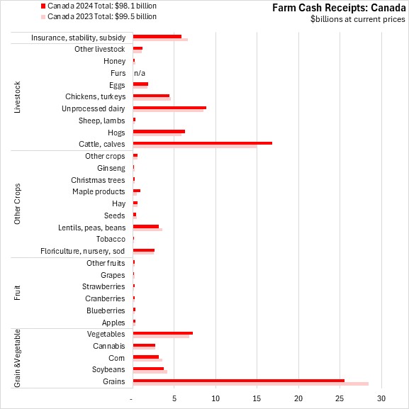 Across the country, grains (wheat, oats, barley, rye, flaxseed) make up the largest farm cash receipts, followed by cattle/calves and dairy. The largest growth in Canadian cash receipts in 2024 were from, cattle/calves, hogs, vegetables and maple products. Grain, soybeans, corn and lentils reported the largest dollar value declines in Canadian farm cash receipts in 2024.