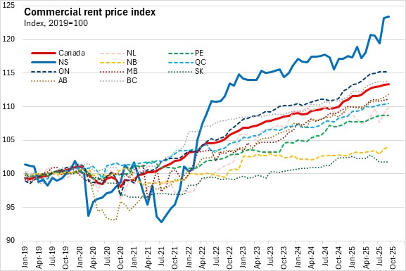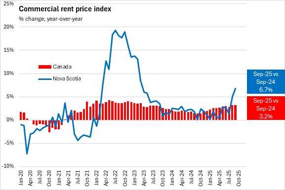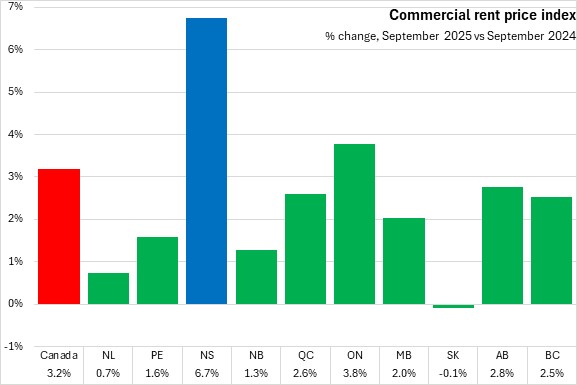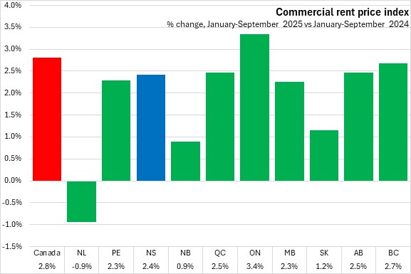 Comparing the commercial rent price index for the first nine months of 2025 with the same period in 2024, Nova Scotia's commercial rents were up 2.4%. The national increase in commercial rents was 2.8% with gains in all provinces except Newfoundland and Labrador, with the fastest rise in Ontario.