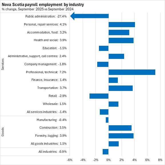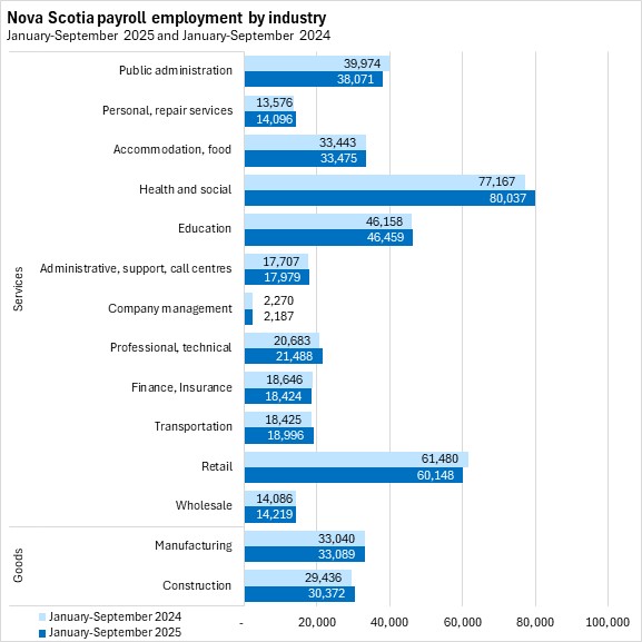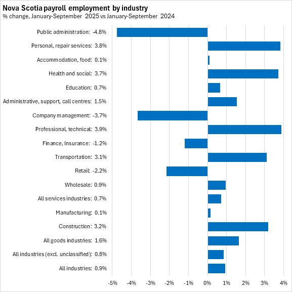 Professional/technical, personal/repair services, and health care/social assistance reported the fastest growth in payroll employment in the first nine months of 2025 in Nova Scotia. The fastest declines were reported in public administration and company management.