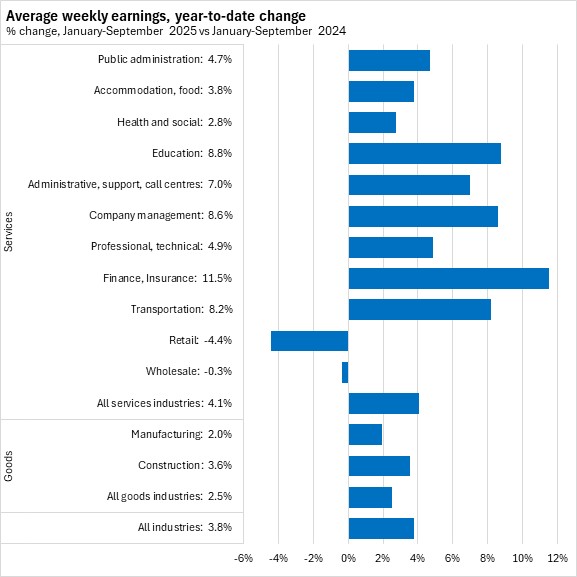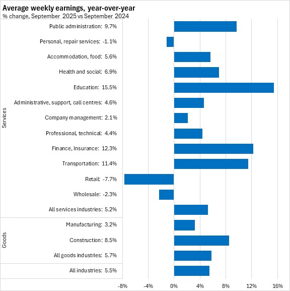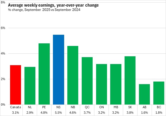 Average weekly wages grew by 5.5% in Nova Scotia from September 2024 to September 2025, the fastest gain among provinces. This was stronger than the national pace of 3.1%.