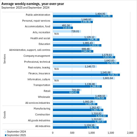 Nova Scotians' average weekly earnings were $1,185.76 in September 2025, a gain of $8.24 (+0.70%) from August 2025.