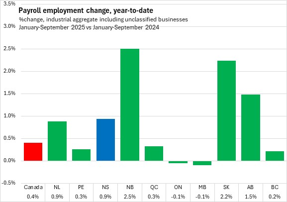 In the first nine months of 2025, Nova Scotia's payroll employment increased 0.9%. This was faster than the national average of 0.4% as all provinces reported growth except Ontario and Manitoba. The fastest year-to-date growth was reported in New Brunswick and Saskatchewan.