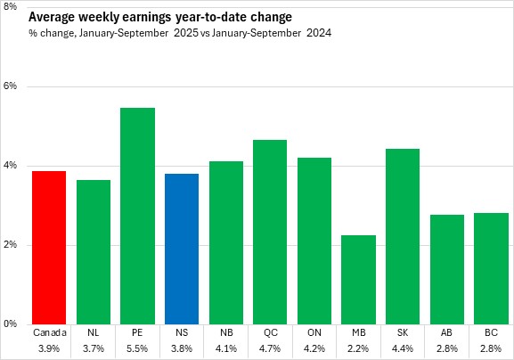 In January-September 2025, average weekly earnings grew 3.8% in Nova Scotia compared to the same period last year. National average weekly earnings grew 3.9% with all provinces reporting growth over this period. Prince Edward Island reported the fastest growth while Manitoba reported the slowest.